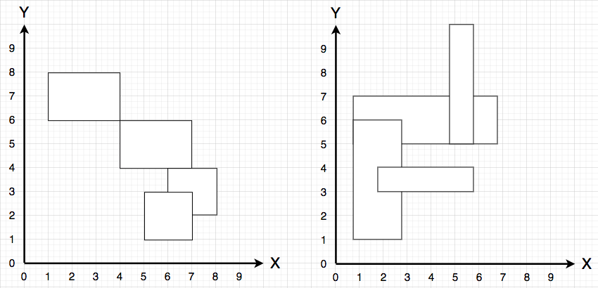 단, 서로 다른 두 직사각형의 x축 좌표 또는 y축 좌표가 같은 경우는 없습니다.