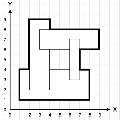 지형은 각 변이 x축, y축과 평행한 직사각형이 겹쳐진 형태로 표현하며, 캐릭터는 이 다각형의 둘레(굵은 선)를 따라서 이동합니다.