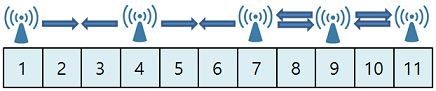 예를 들어 11개의 아파트가 쭉 늘어서 있고, [4, 11] 번째 아파트 옥상에는 4g 기지국이 설치되어 있습니다. 만약 이 4g 기지국이 전파 도달 거리가 1인 5g 기지국으로 바뀔 경우 모든 아파트에 전파를 전달할 수 없습니다. (전파의 도달 거리가 W일 땐, 기지국이 설치된 아파트를 기준으로 전파를 양쪽으로 W만큼 전달할 수 있습니다.)